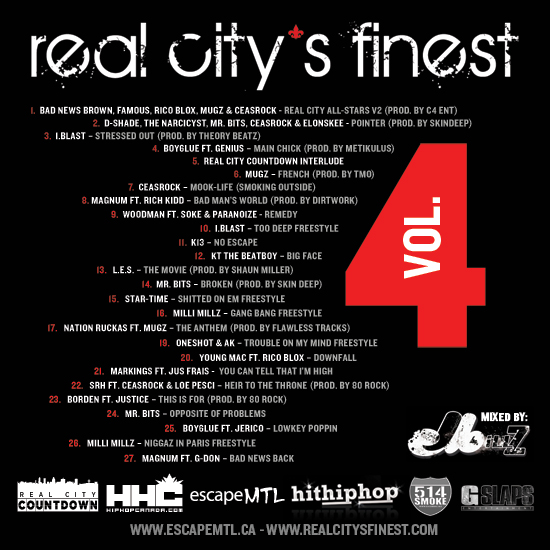 The folks at EscapeMTL & Real City’s Finest team up with yours truly for the release of this new mixtape featuring brand new music from the top talent out of Montreal, Canada, including SRH, Loe Pesci, I.Blast, Magnum, Mugz, Milli Millz, Mr. Bits, CeasRock, Borden & more. Peep the back cover, tracklist & download link after the jump!